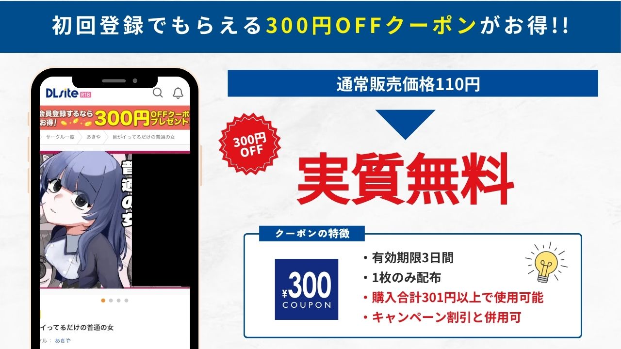 DLsiteの初回登録でもらえる300円OFFクーポンを使えば、実質0円で読むことが可能です。